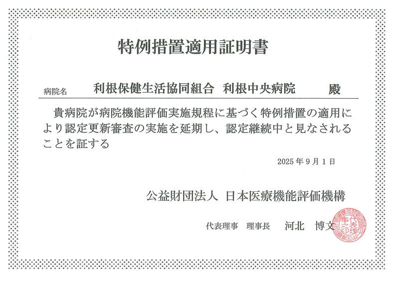 なお、2025年9月末現在、当院は病院機能評価の受審申請を行っております。このため、病院機能評価実施規程に基づく特例措置により、2025年9月26日以降も認定が継続されております。