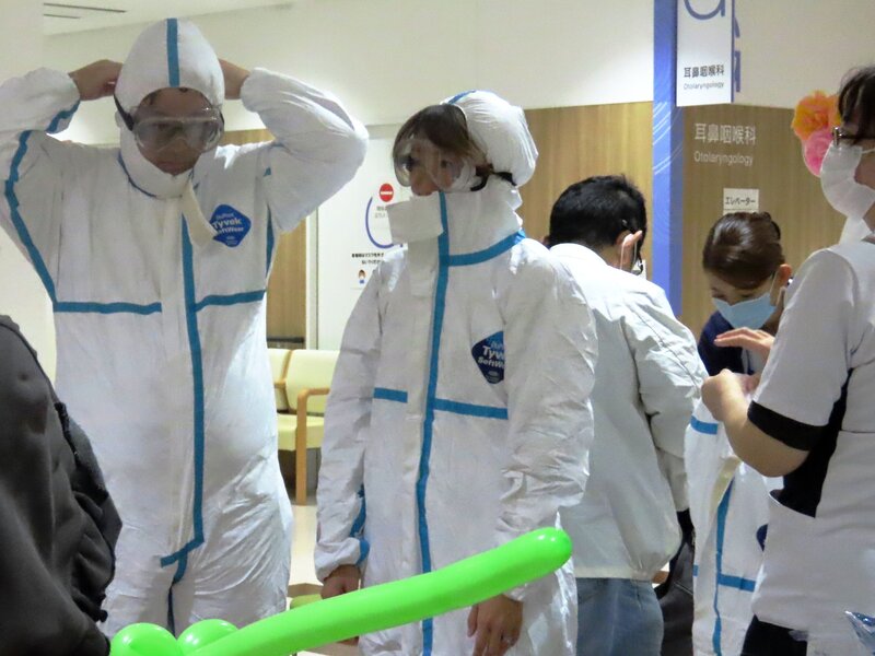 当院からは職員による腹腔鏡手術やコロナ対応装備、似顔絵セラピーなどの体験コーナー、バルーンアートの実演などを行いました。各部署からも工夫を凝らした手作りパネルの展示などが行われ多くの方にご覧いただきました。