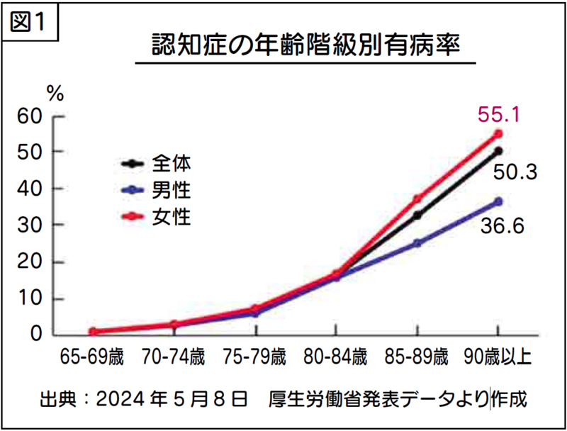 厚生労働省の調査によると、65歳以上の高齢者で認知症の人の割合は2022年時点では8人に1人でしたが、2025年には高齢者の5人に1人が認知症になると言われてきました。また、認知症は75歳くらいから急激に増加し、高齢になるほどリスクが高まる傾向にあります(図1)。そのため、これからは認知症について、1人ひとりがひとごとではなく自分や家族のこととして考えていく必要があります。